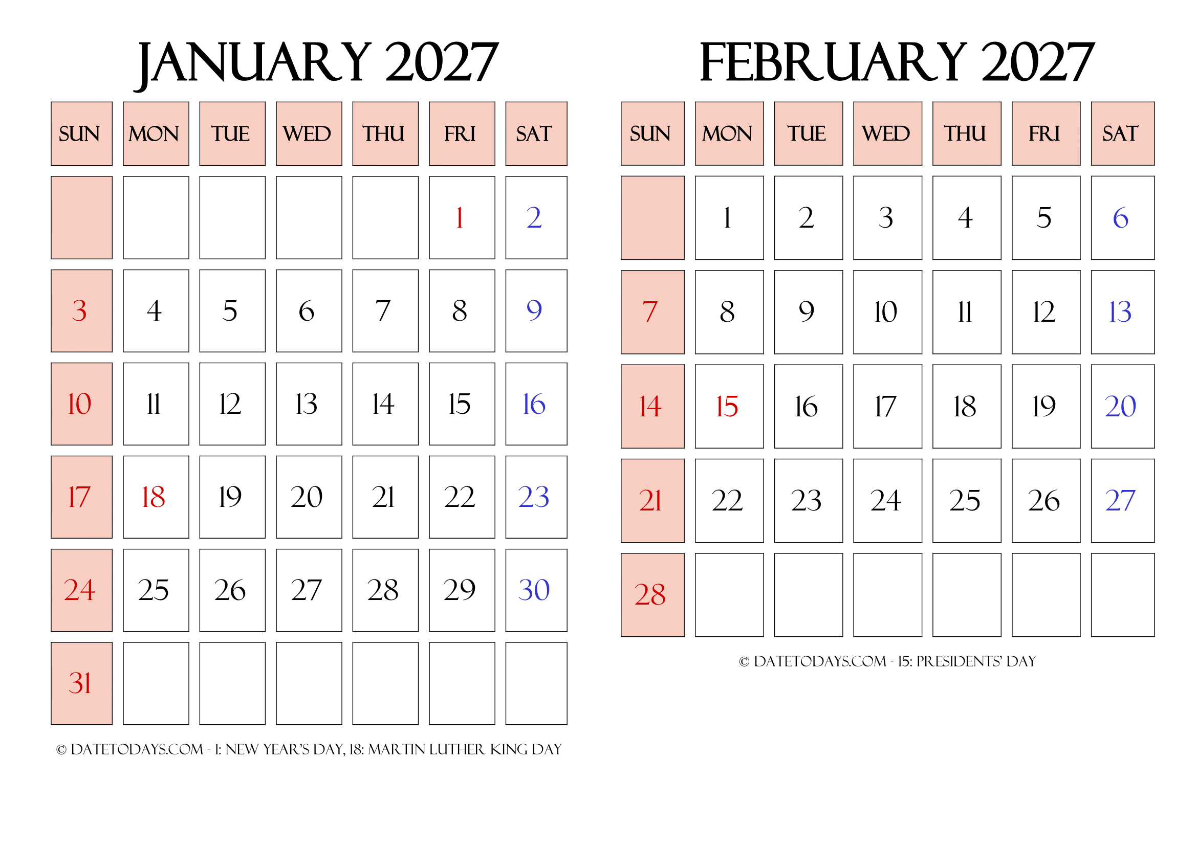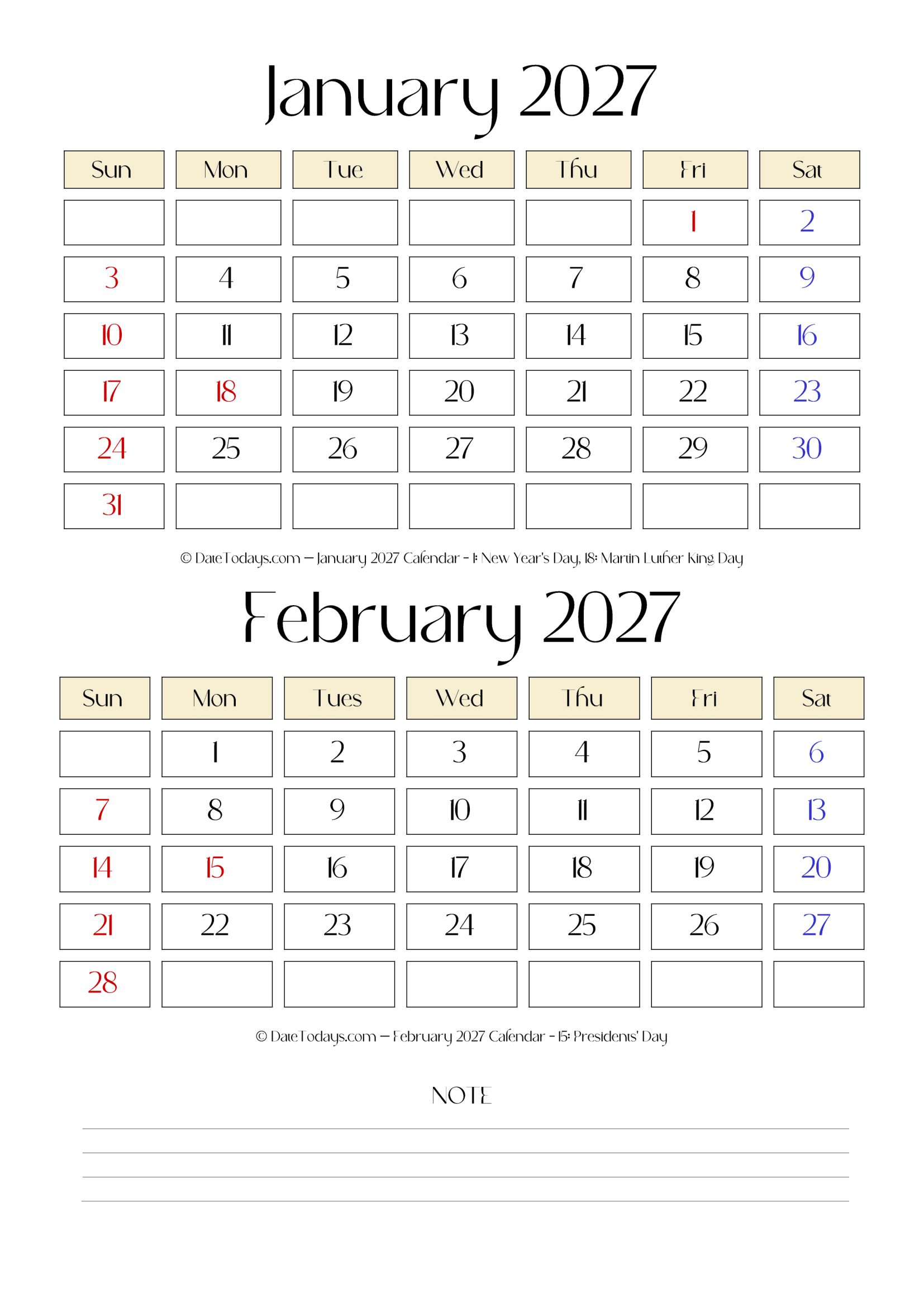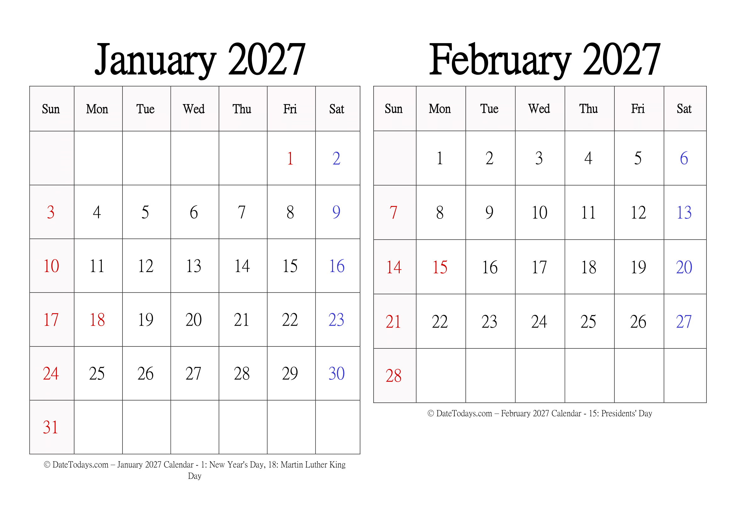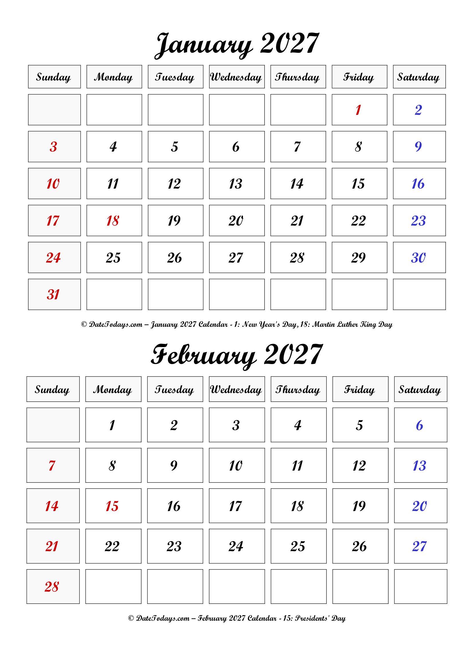 Now, I am presenting 14 different January February 2027 calendar designs in various colors and fonts, available in both vertical and horizontal layouts. You can easily download and print them on A4 or Letter-size paper.