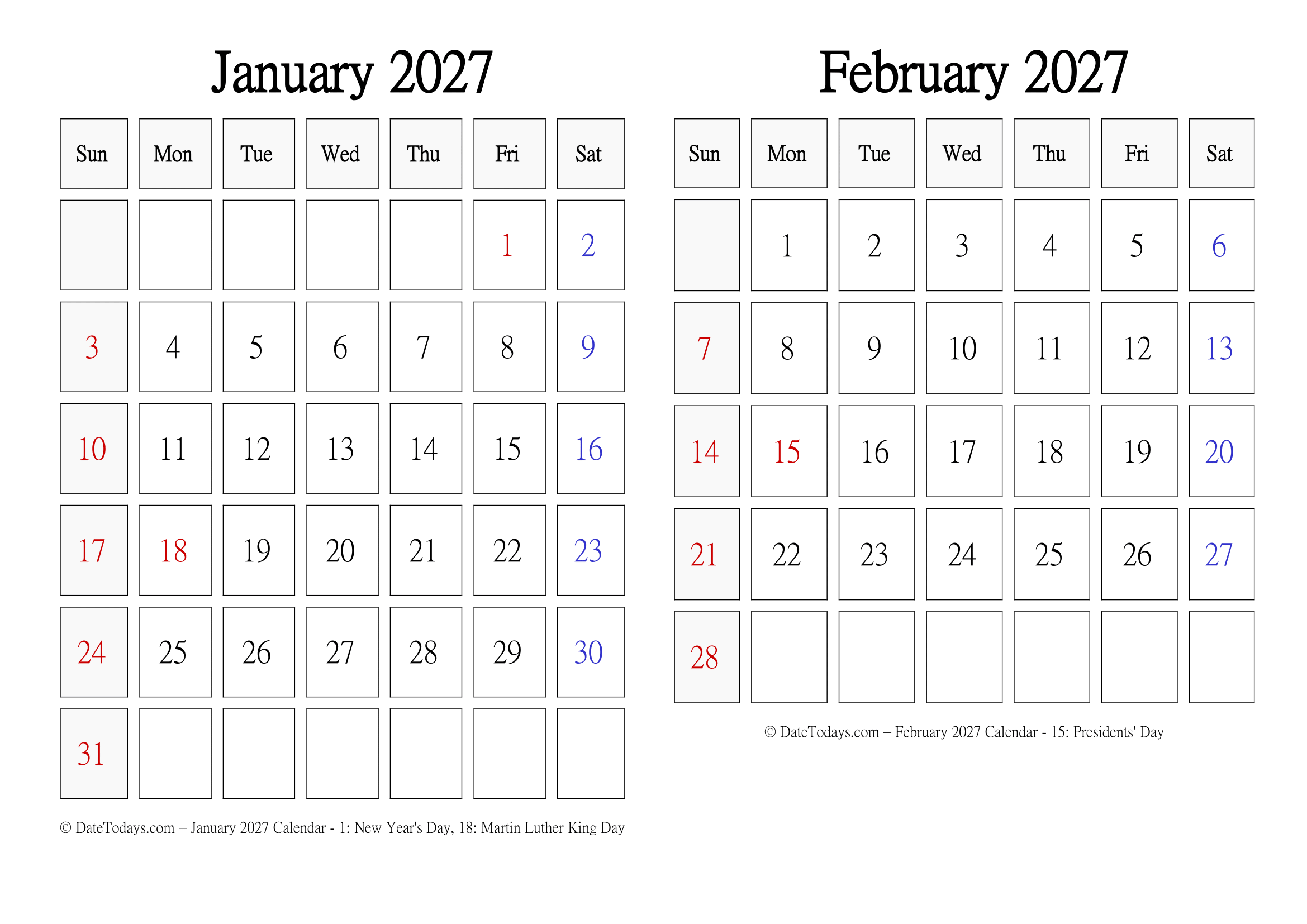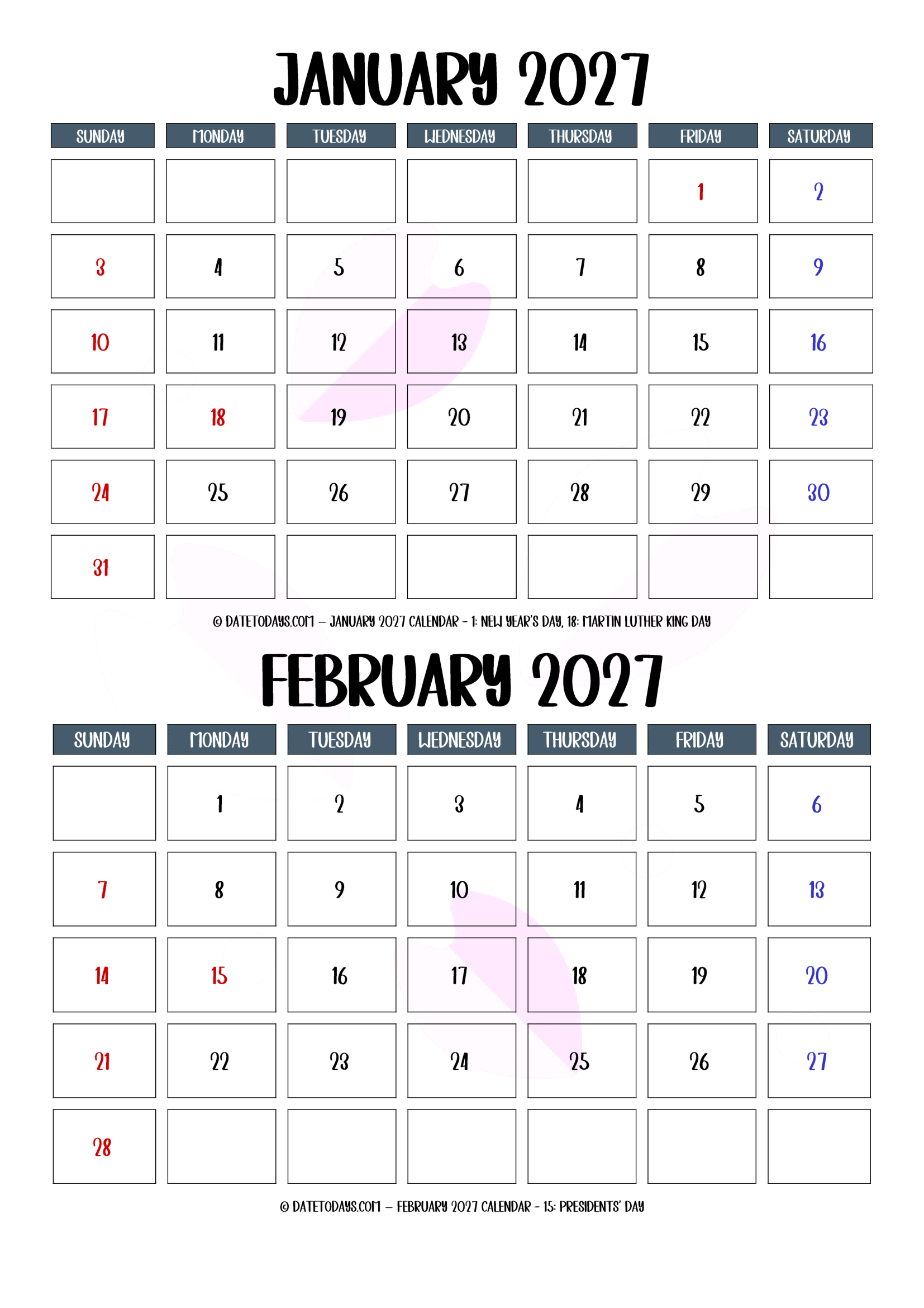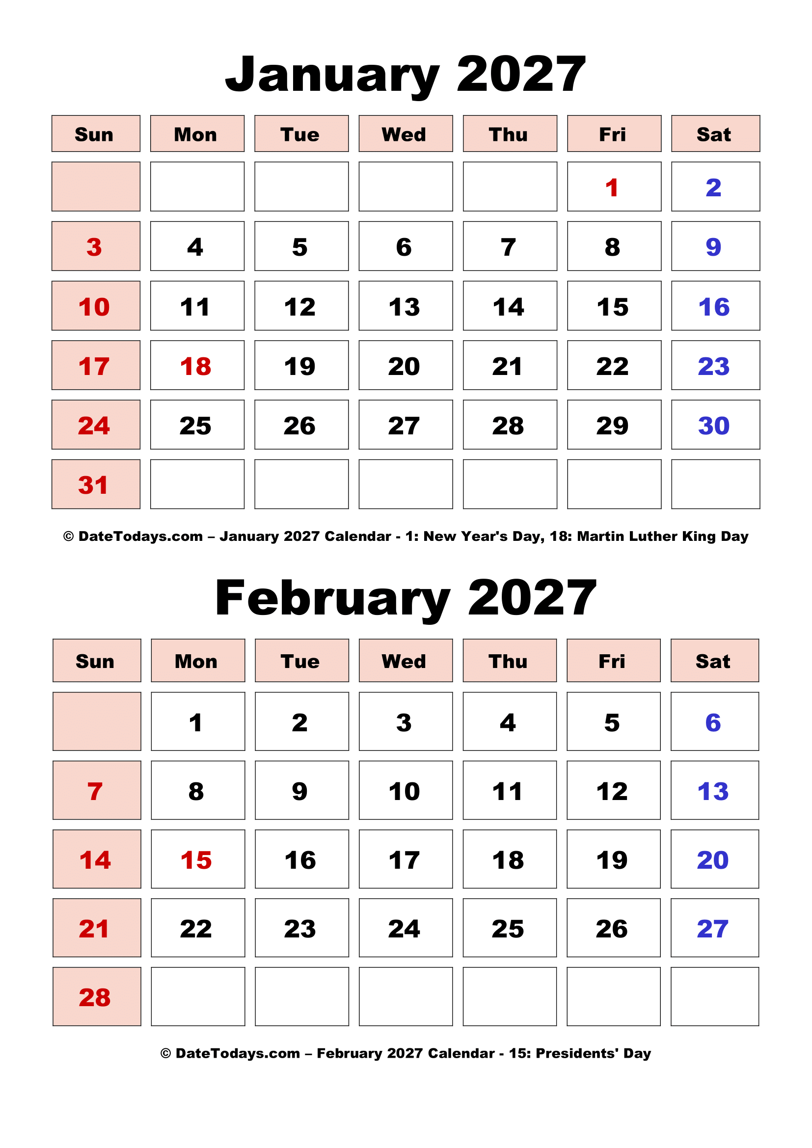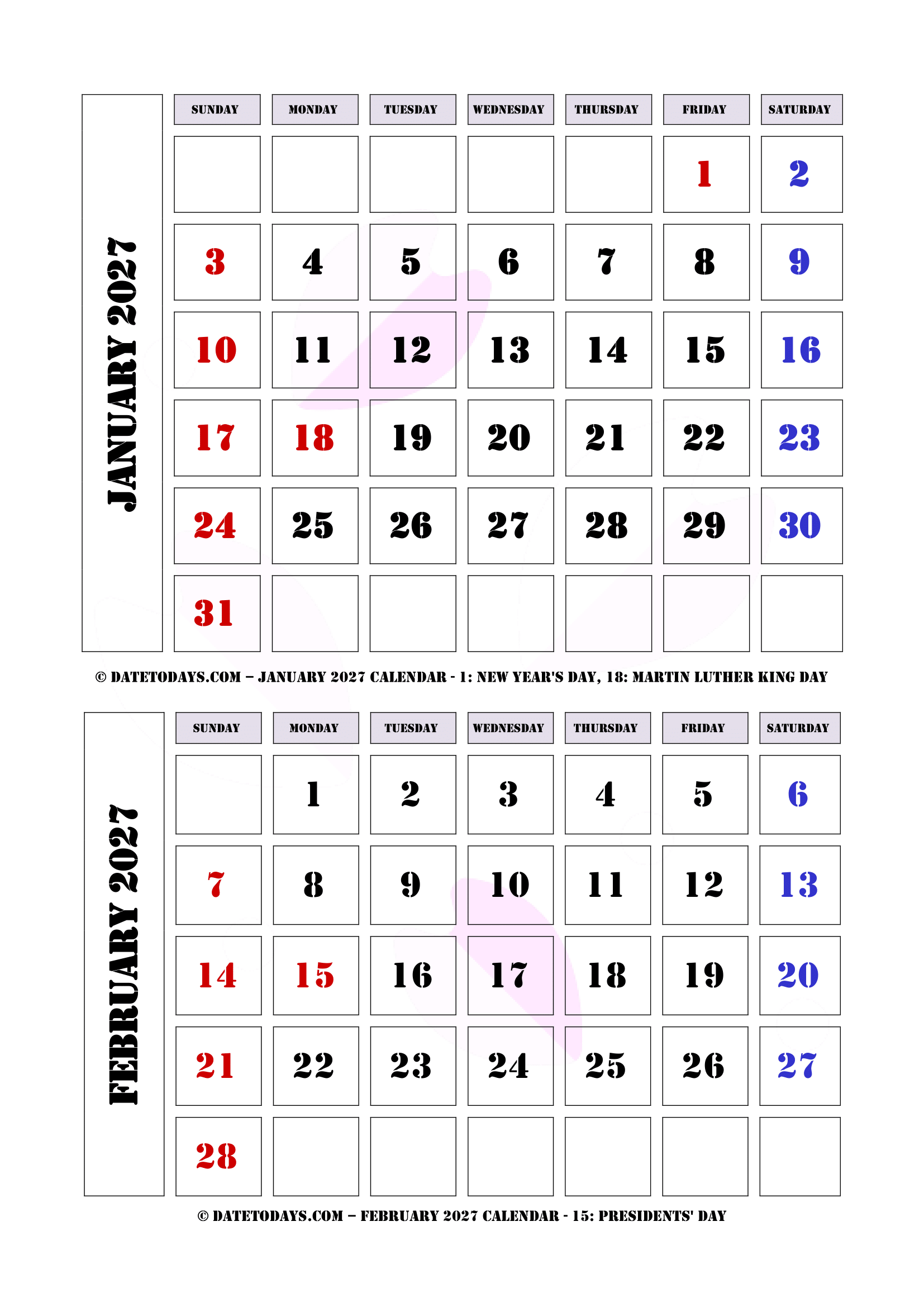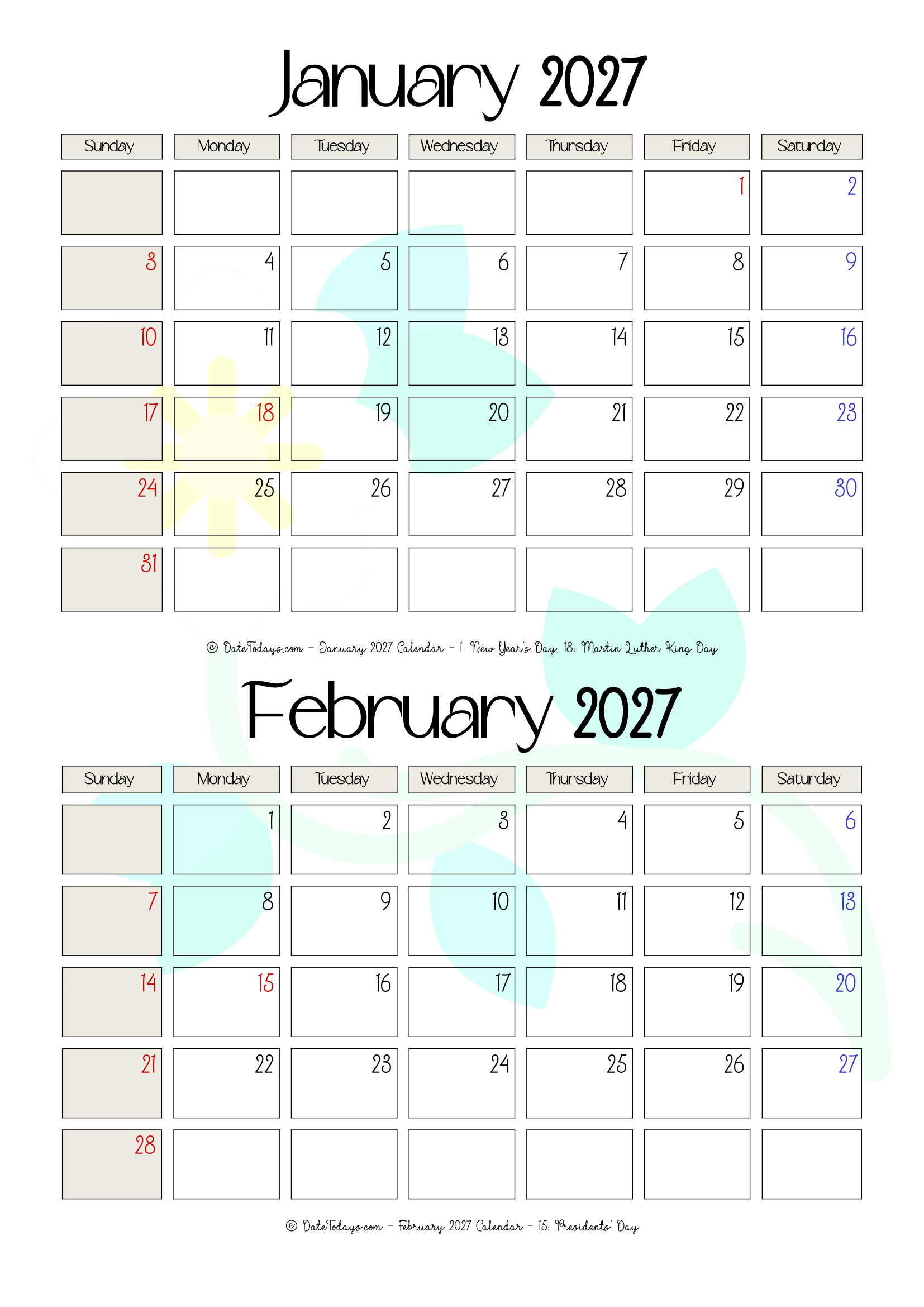 Now, I am presenting 14 different January February 2027 calendar designs in various colors and fonts, available in both vertical and horizontal layouts. You can easily download and print them on A4 or Letter-size paper.