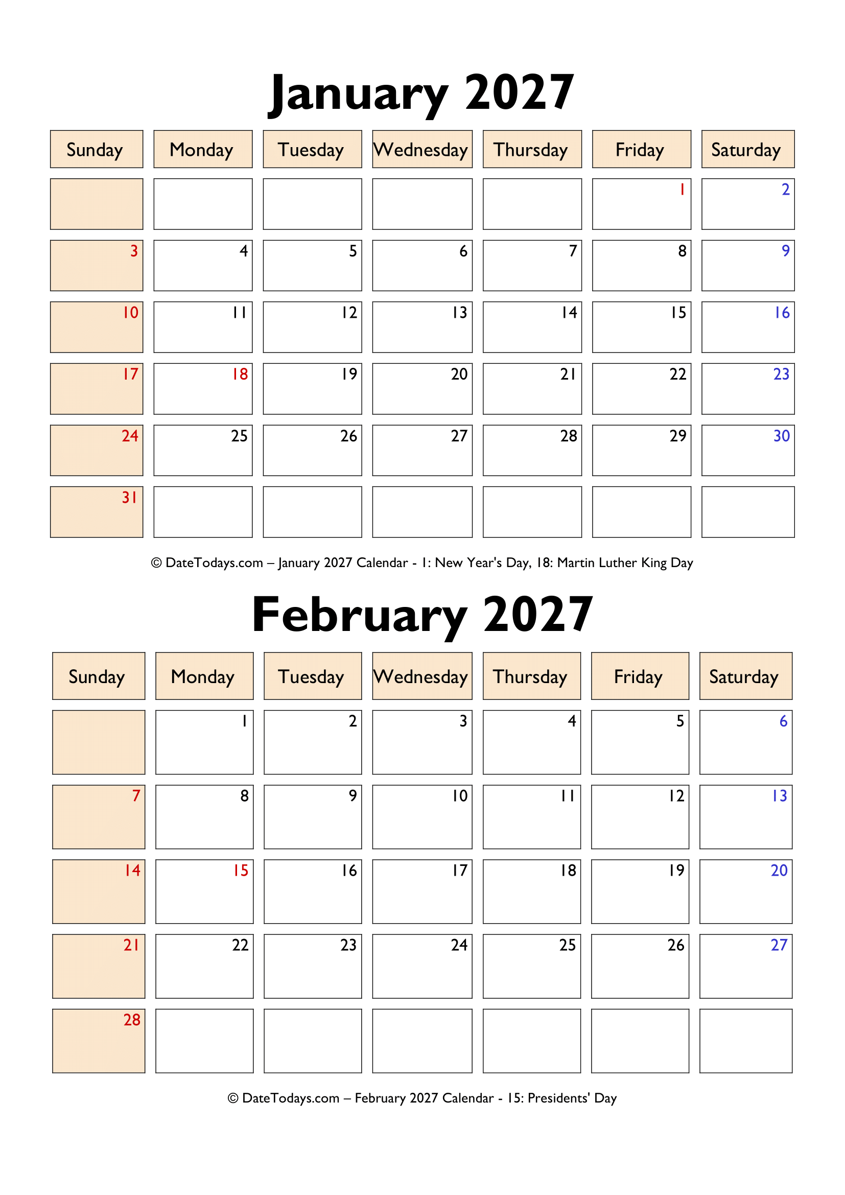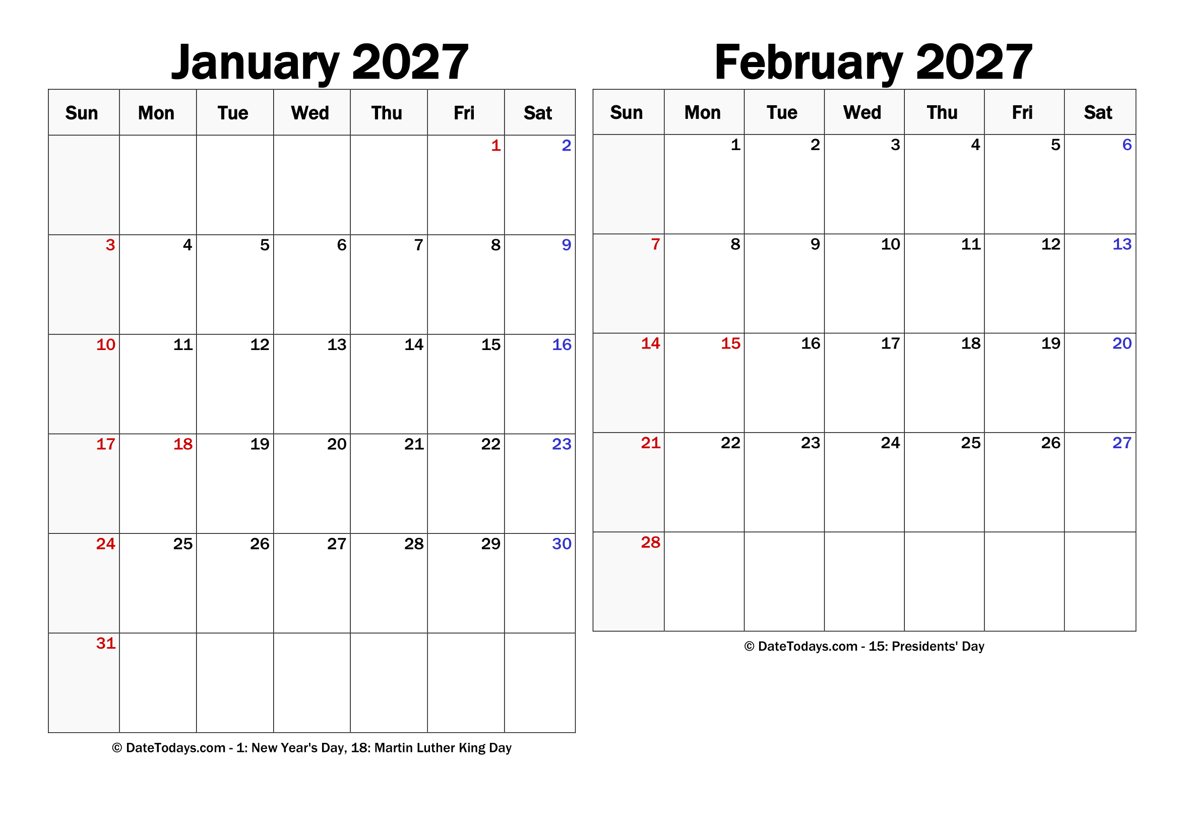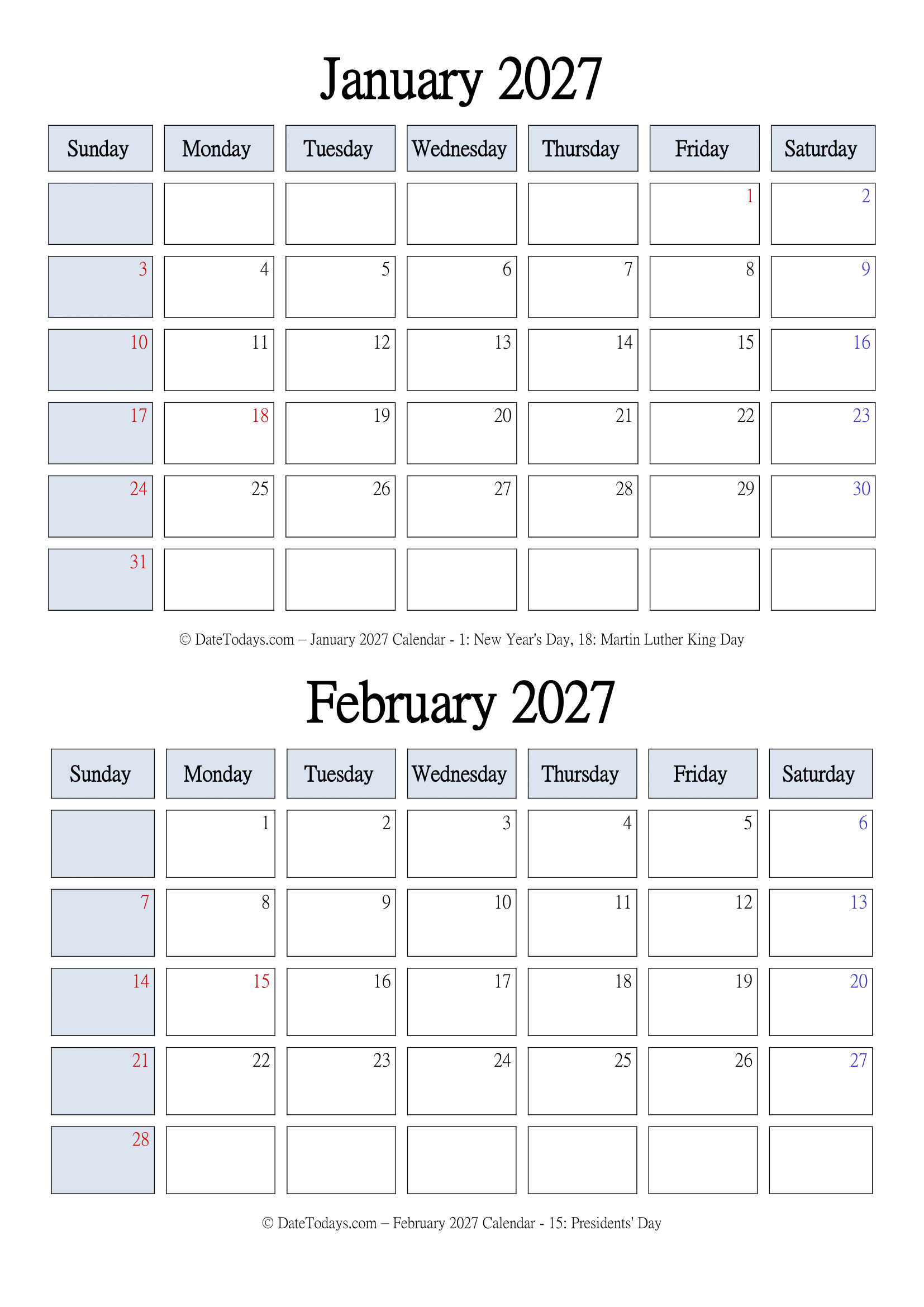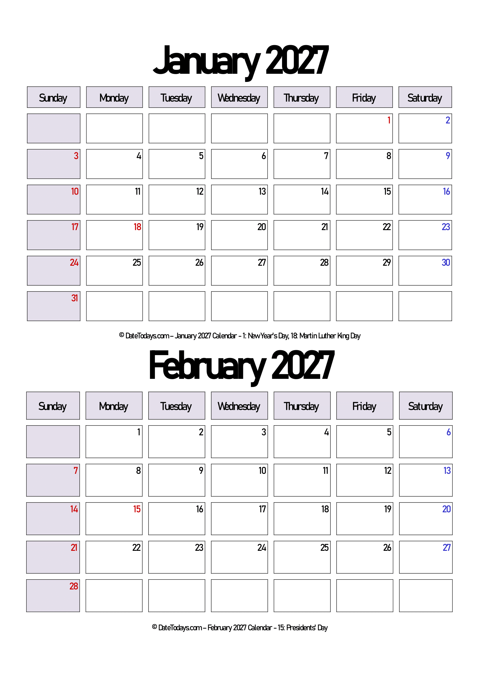 Now, I am presenting 14 different January February 2027 calendar designs in various colors and fonts, available in both vertical and horizontal layouts. You can easily download and print them on A4 or Letter-size paper.