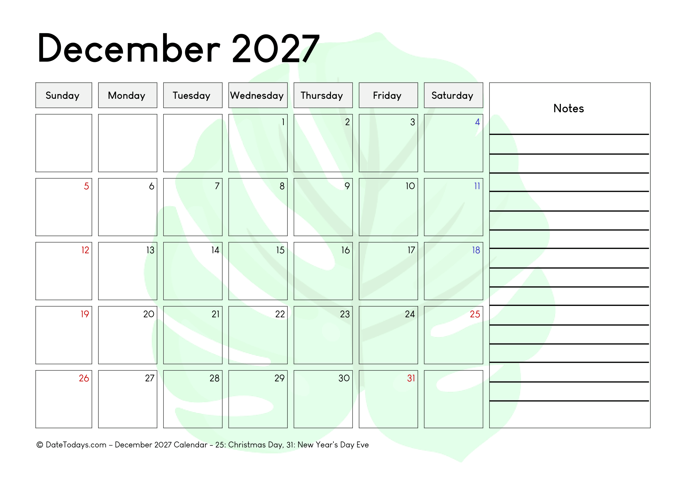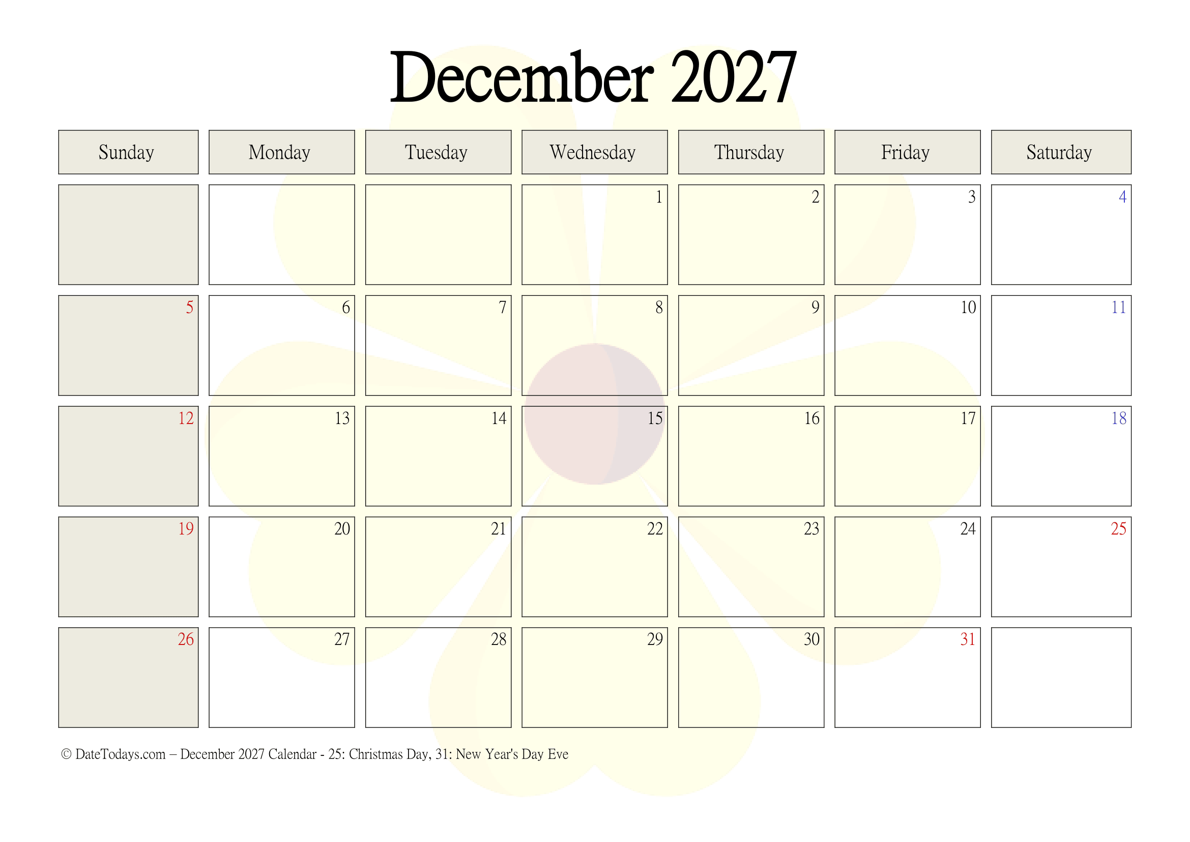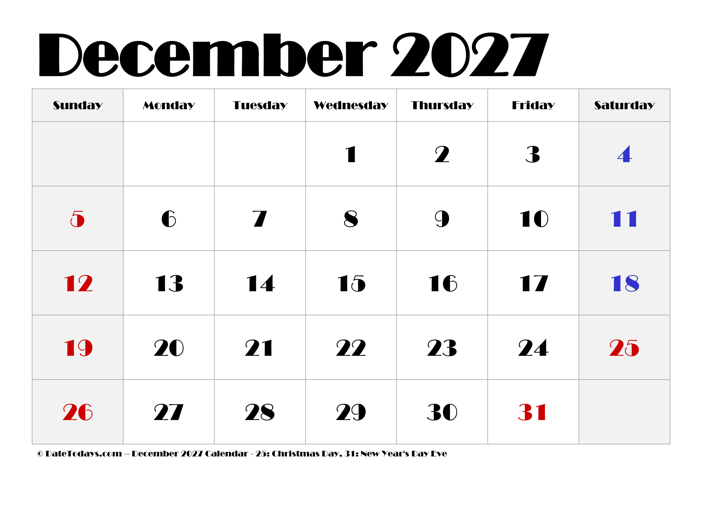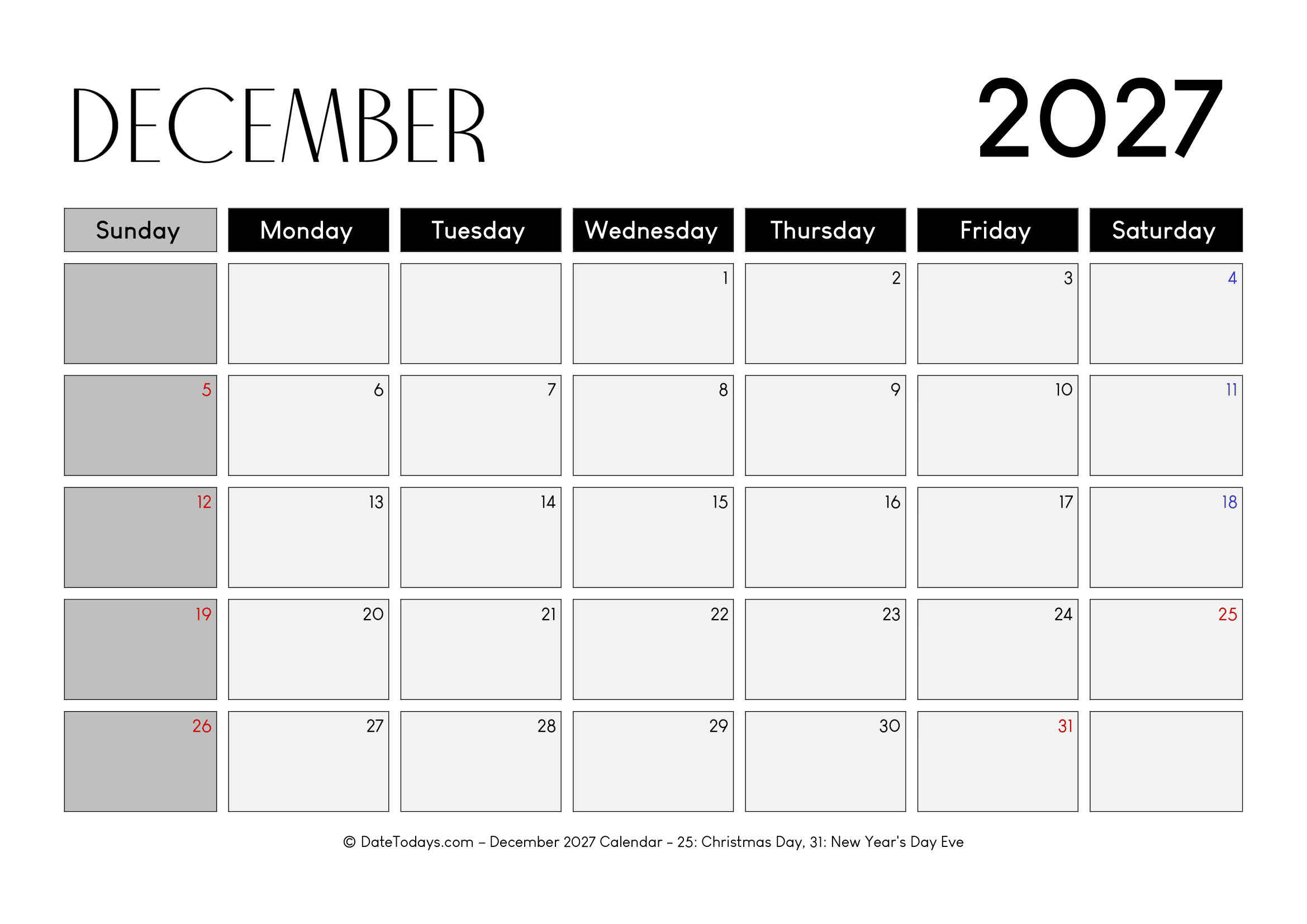 If you desire to have a simple printable PDF format calendar then, try out the ideal template from datetodays.com to get the ideal December 2027 calendar printable merged with holidays. This calendar is the best option to track the event in a single observation at one place. There are variable numbers of the template that displays all important holidays and notes to ease out your routine. You can give a try to popular year-month format calendar which can be easily downloaded and start planning on your terms and your way! Manage your everyday schedule of a month with a to-do list that is available with our classic free blank template.
