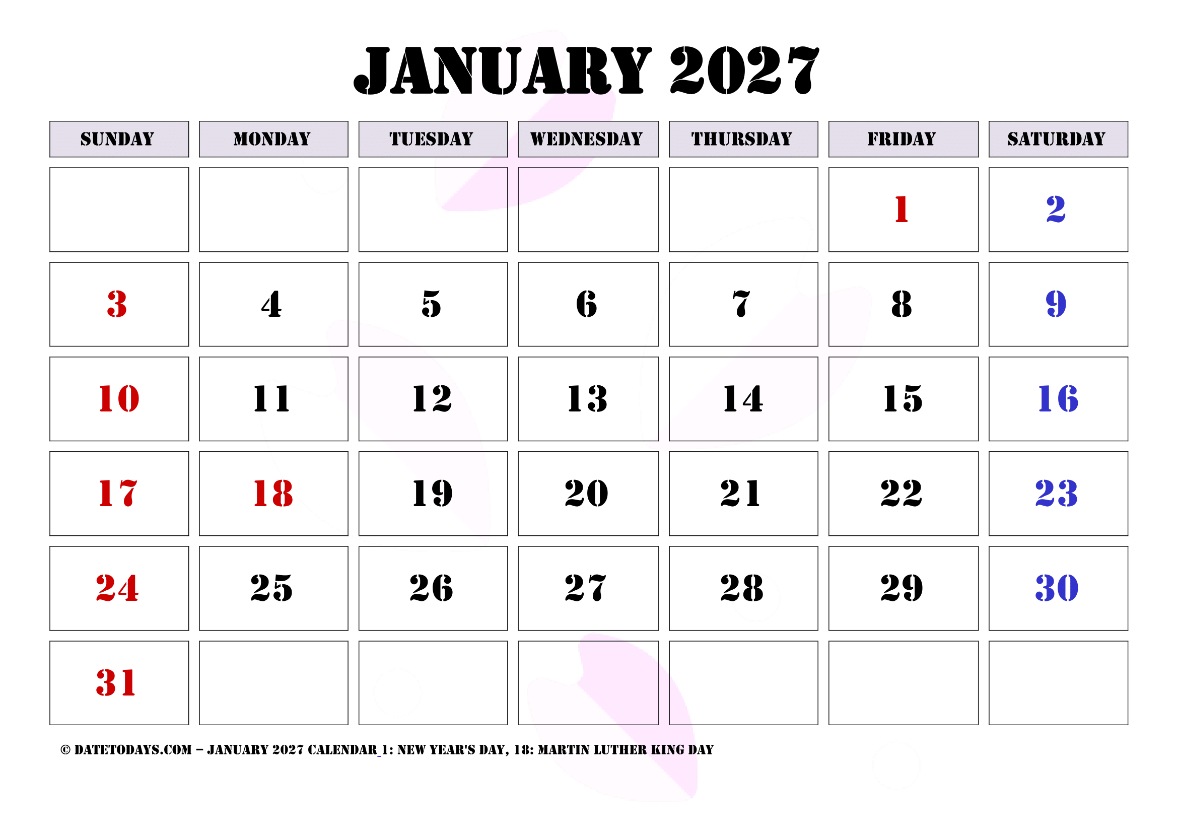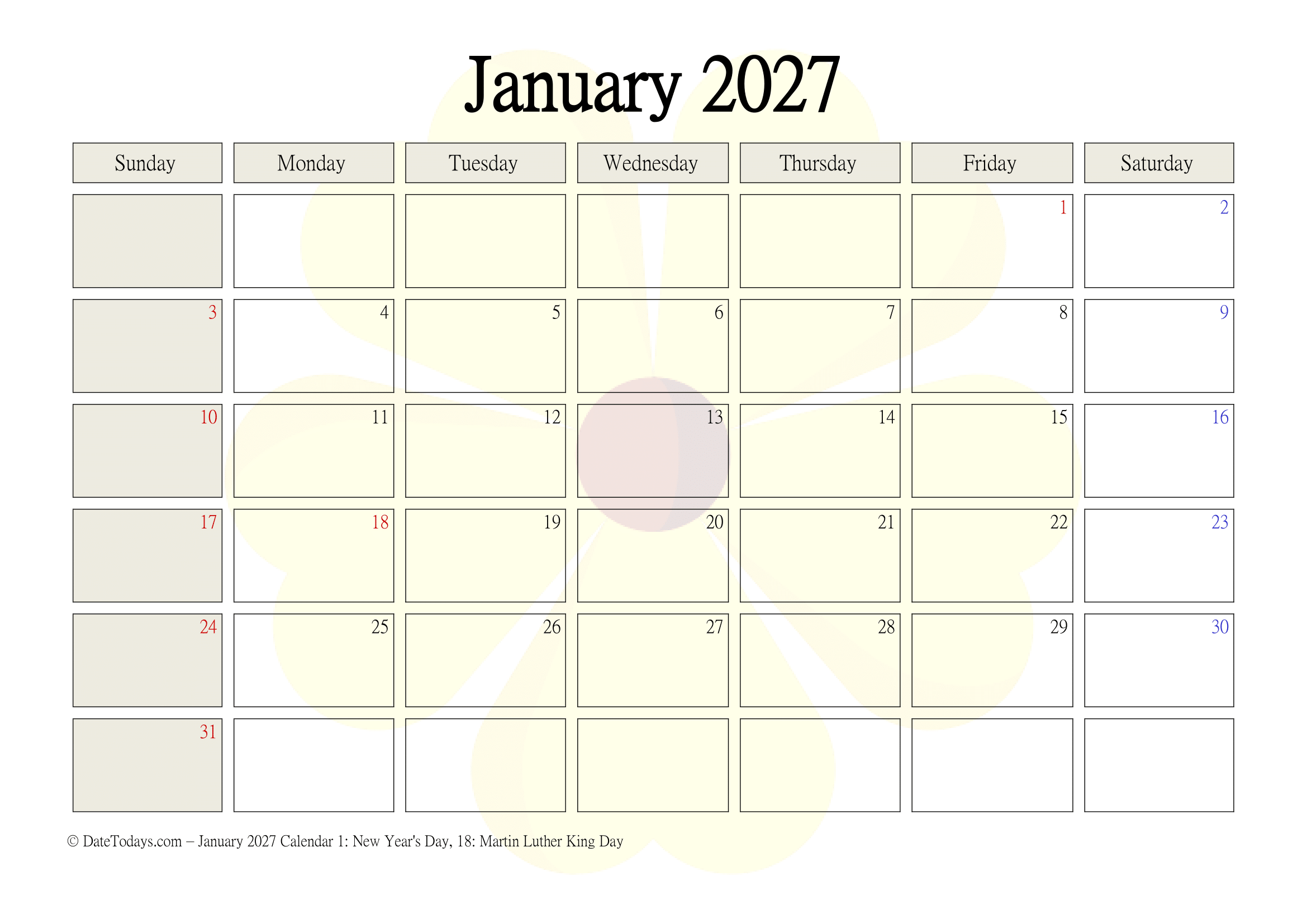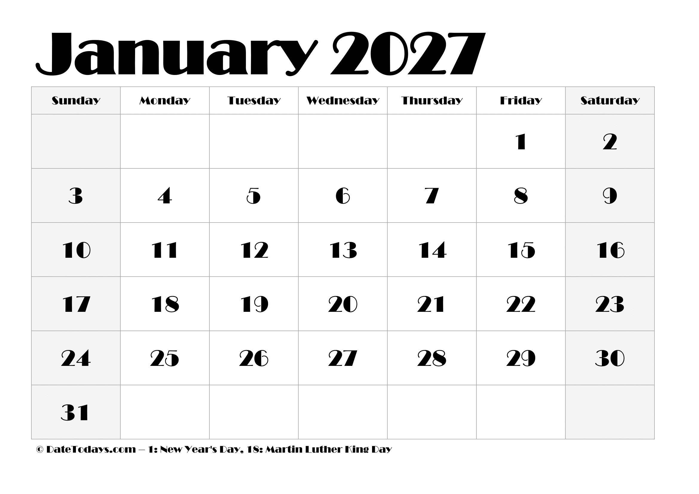 Are you the one who really want to handle their time with complete planning? Then, this is the platform where you can discover the professional format of January 2027 Calendar Printable based on Georgian calendar. The monthly calendar available on this page includes all events and dates that host to be important. The printable available here are easy to download, can be customized and editable as per requirement needed. This printable are quite easy to be accessed or add notes in the form of reminder or task list.