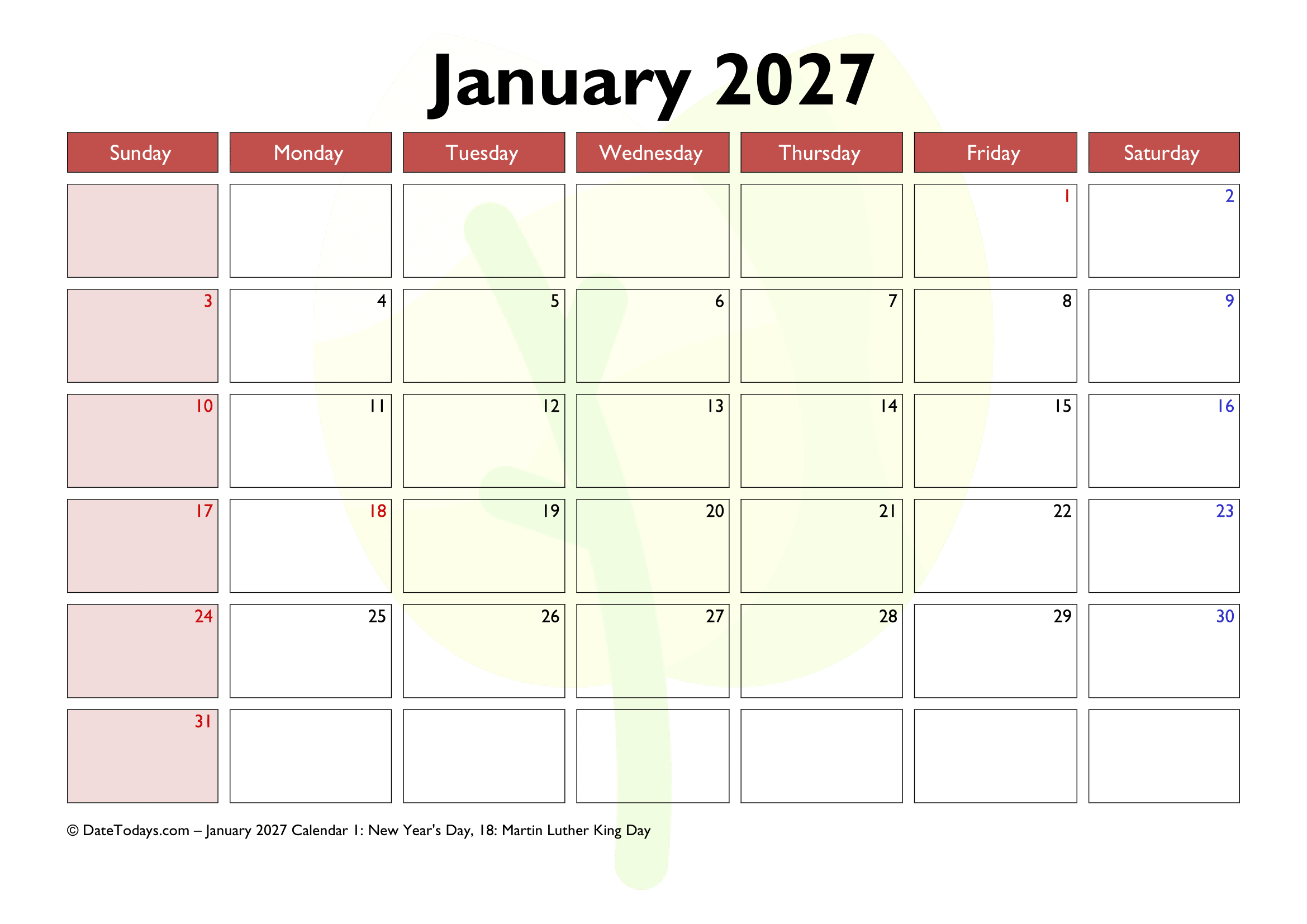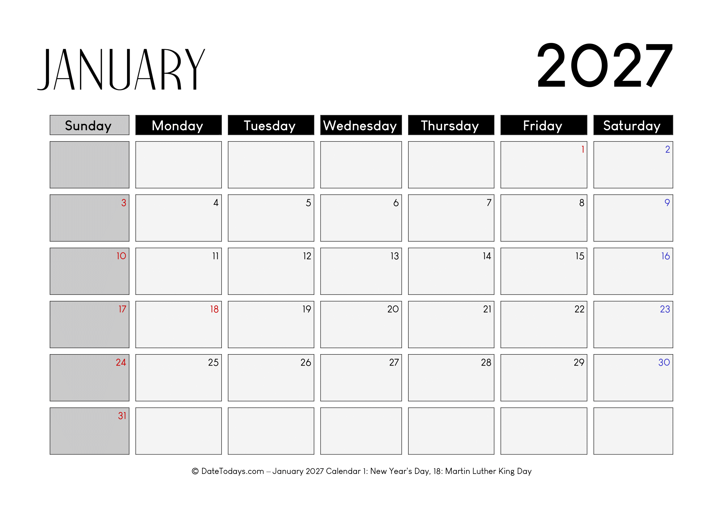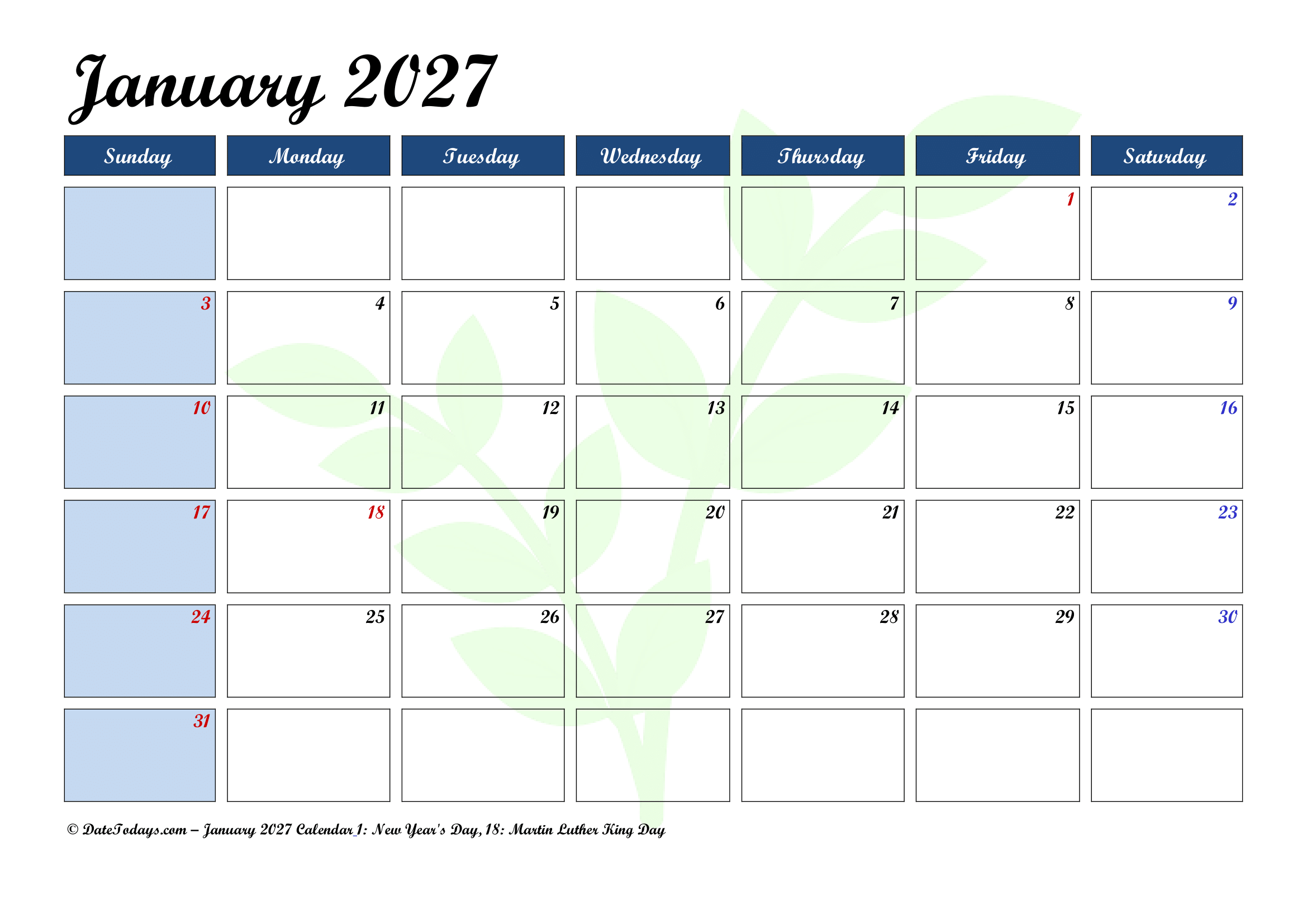 Are you the one who really want to handle their time with complete planning? Then, this is the platform where you can discover the professional format of January 2027 Calendar Printable based on Georgian calendar. The monthly calendar available on this page includes all events and dates that host to be important. The printable available here are easy to download, can be customized and editable as per requirement needed. This printable are quite easy to be accessed or add notes in the form of reminder or task list.