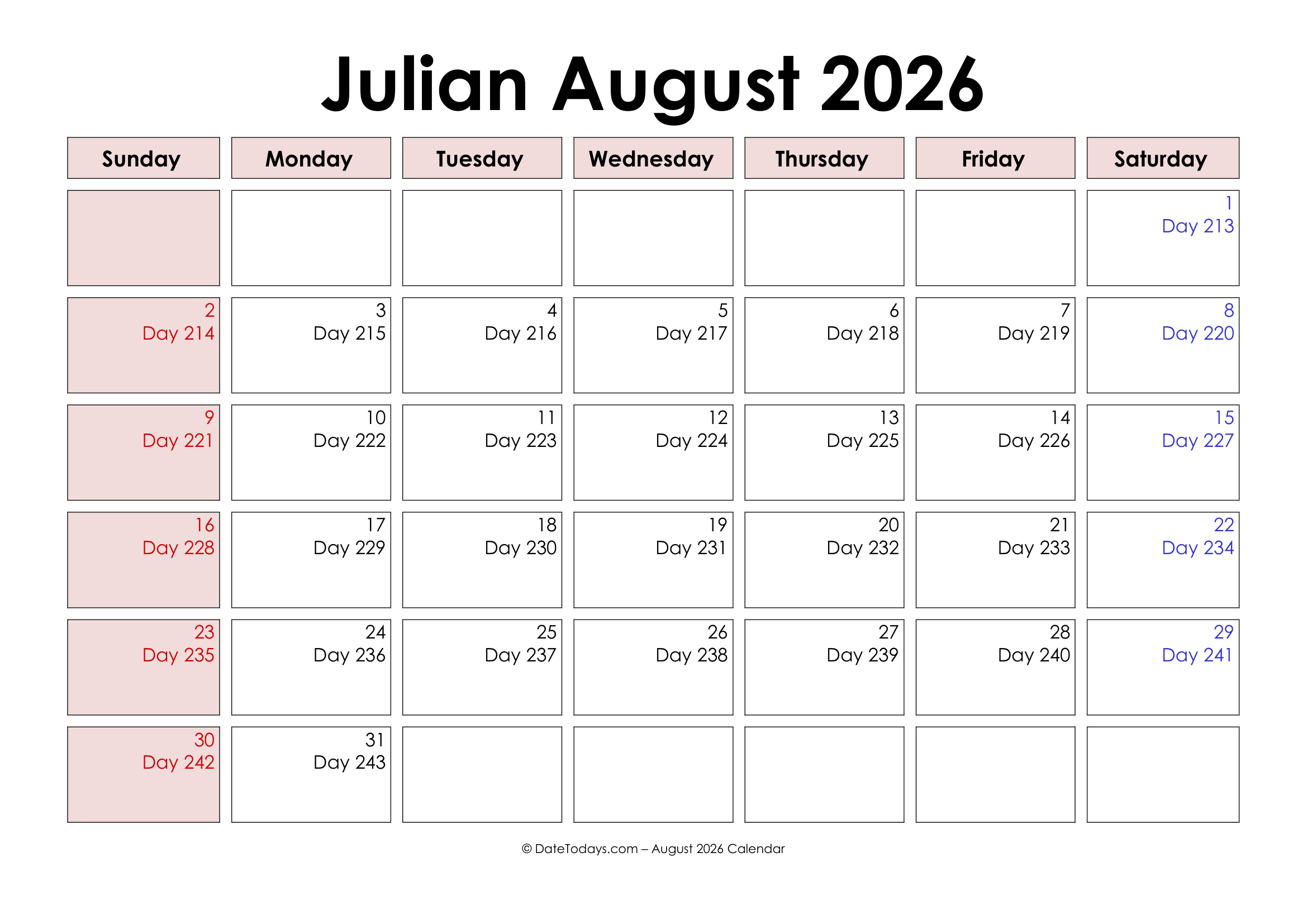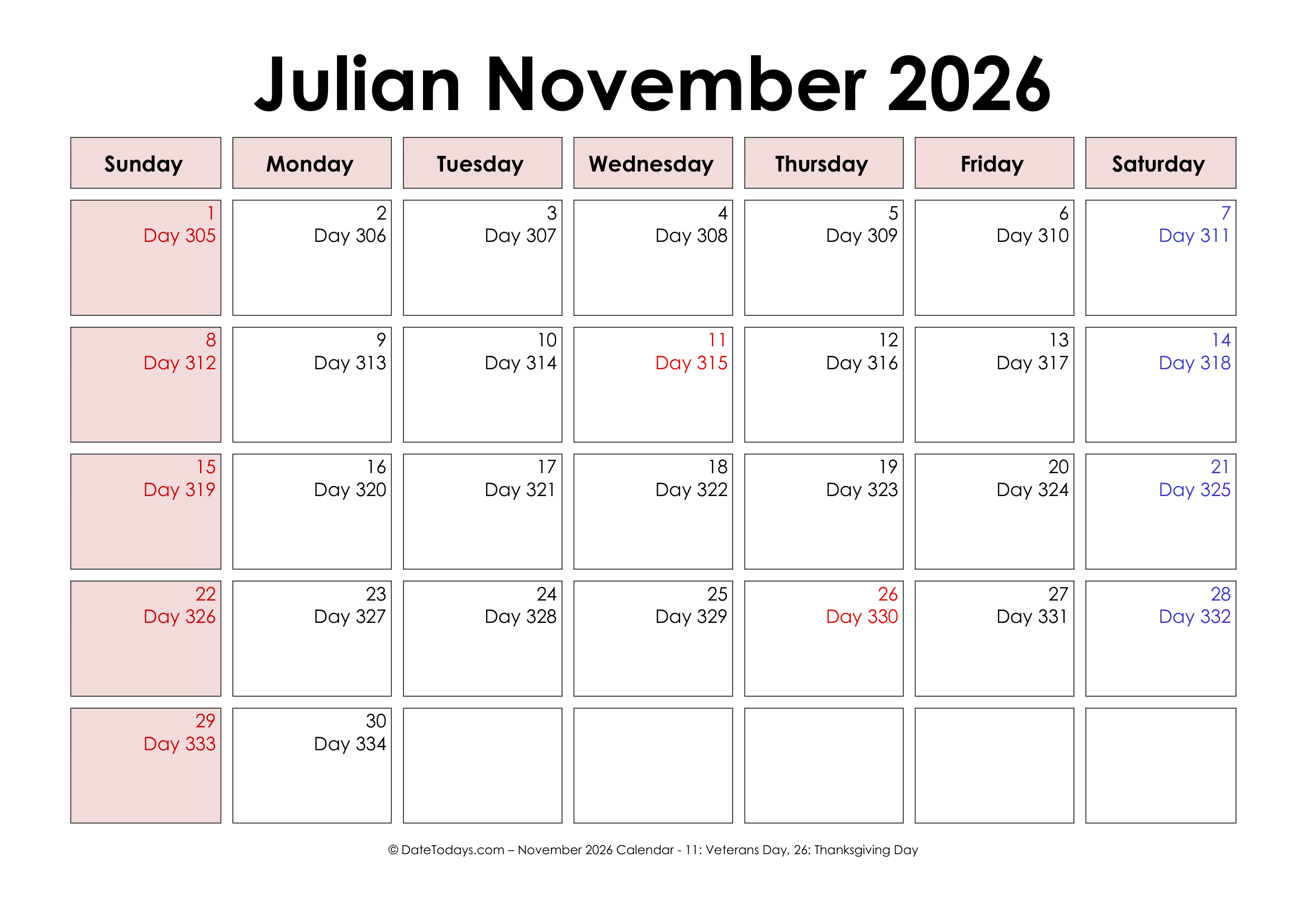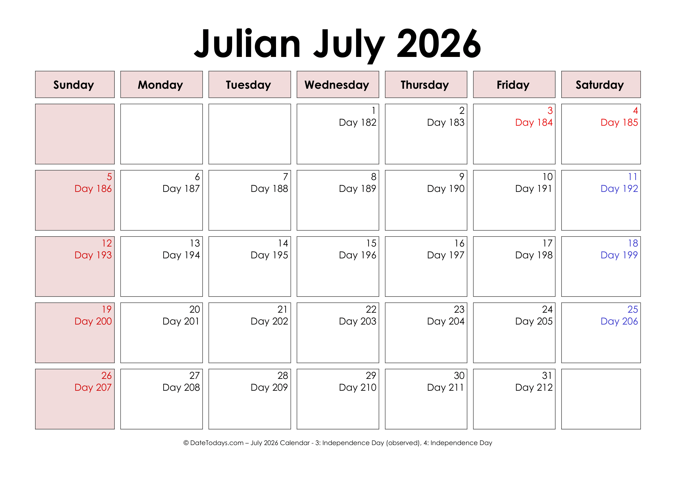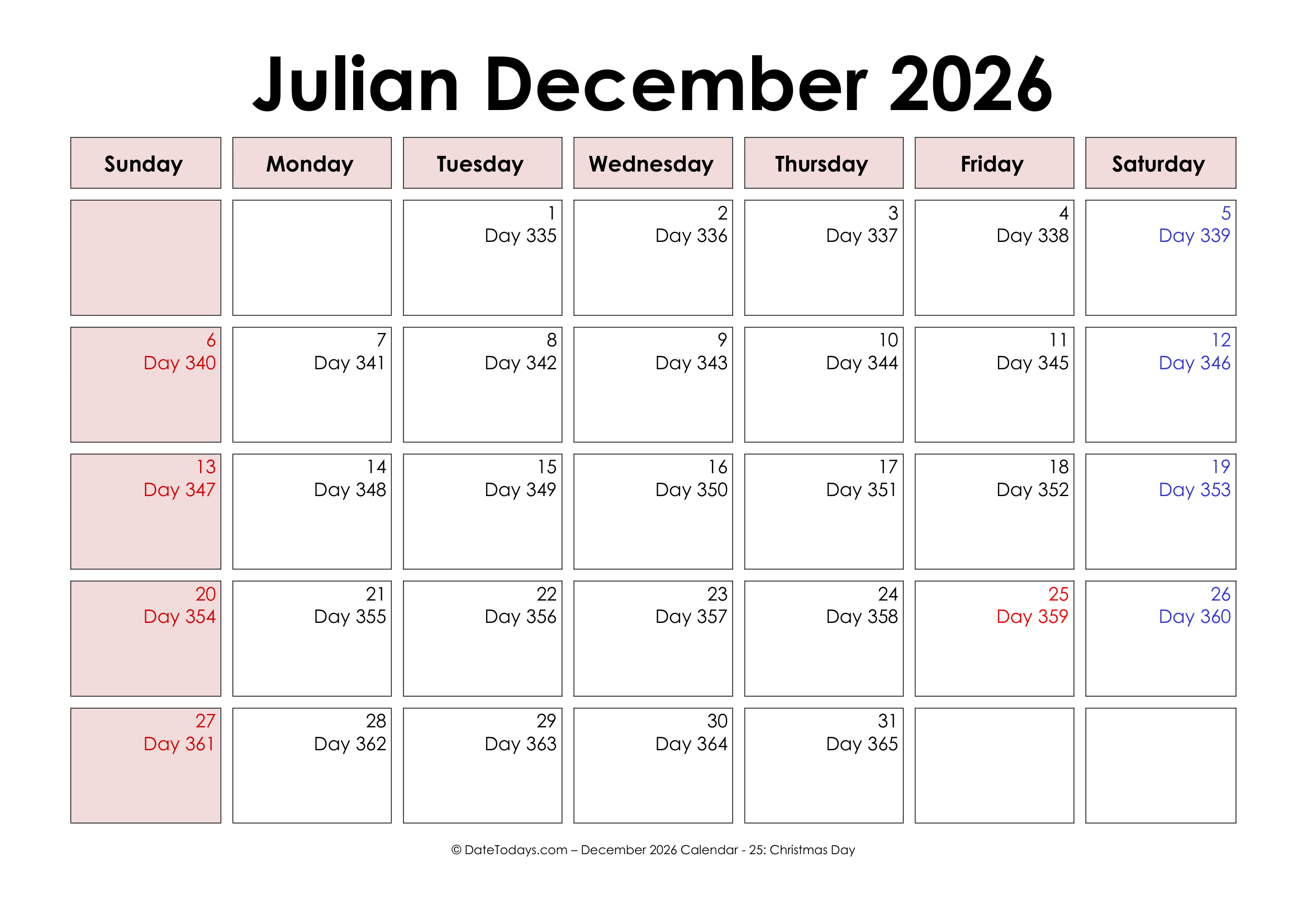 The 2026 calendar with Julian dates template consists of holiday mentions and a small box to notes to note down reminders and essential events. Weekends are also highlighted, making it easy to identify days off. Besides, this is customizable calendar and can be easily downloaded for free in Word and PDF formats. Julian dates are simply a continuous count of days and fractions since noon Universal Time on January 1, 4713 BC (on the Julian calendar).