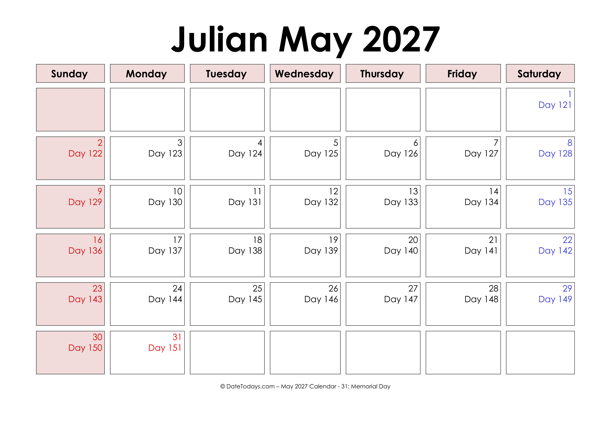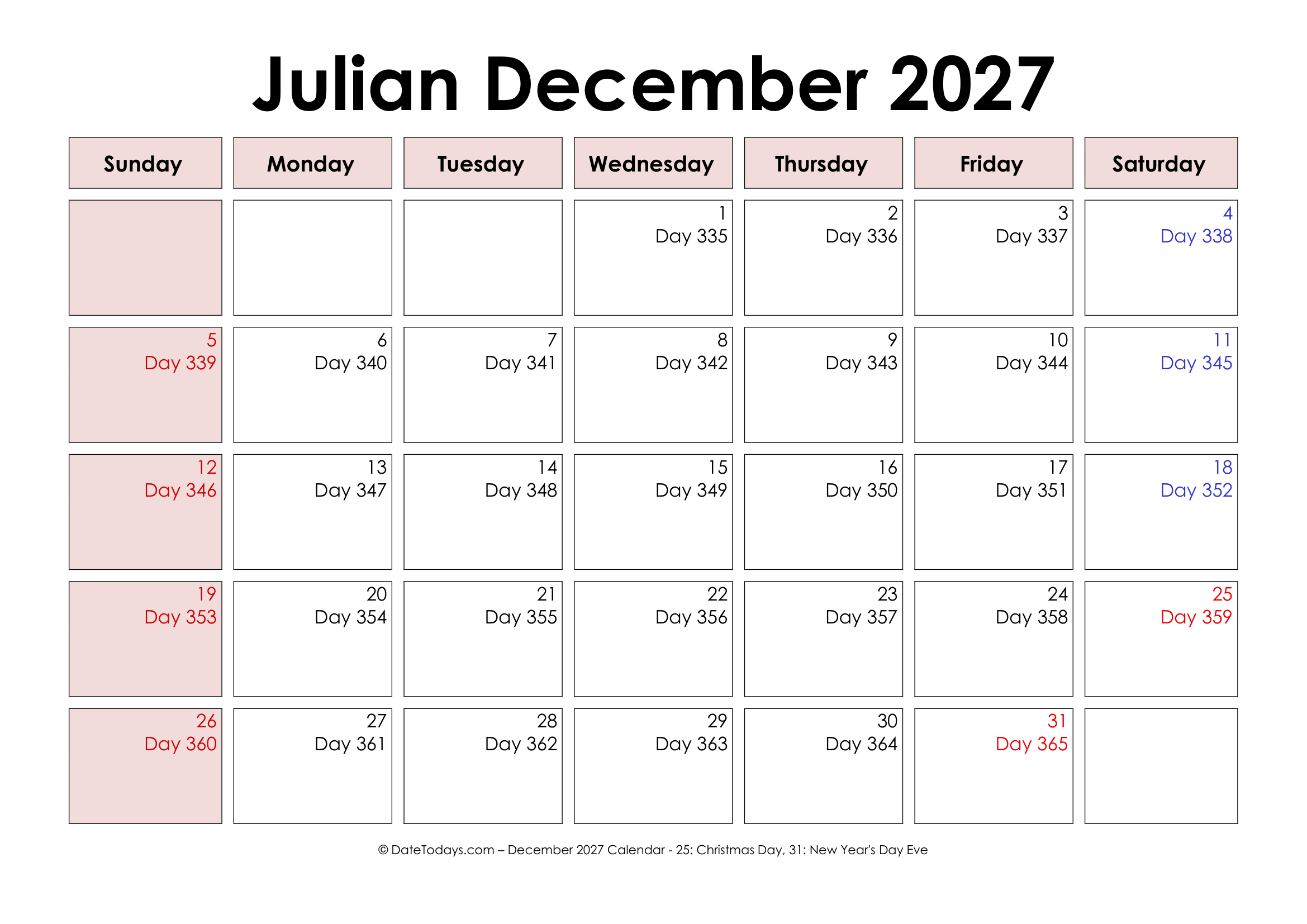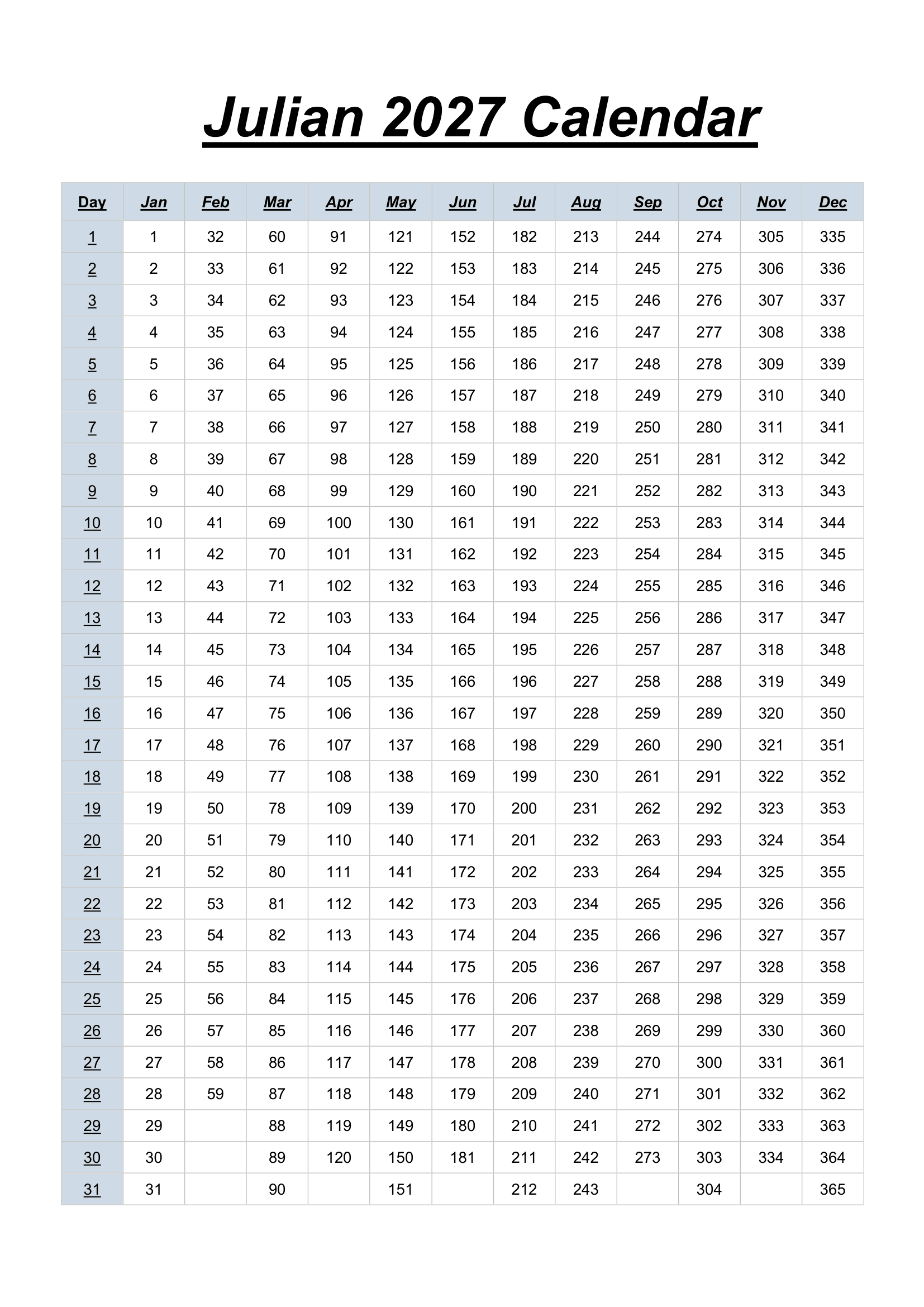 Calendar dates — year, month, and day — are more problematic. A Printable Julian Date Calendar 2027combines the standard Gregorian calendar. This calendar is basically used for daily planning and holidays) with the Julian Date. In 2027, the year is a common year (365 days), meaning January 1 is day 1, and December 31 is day 365.