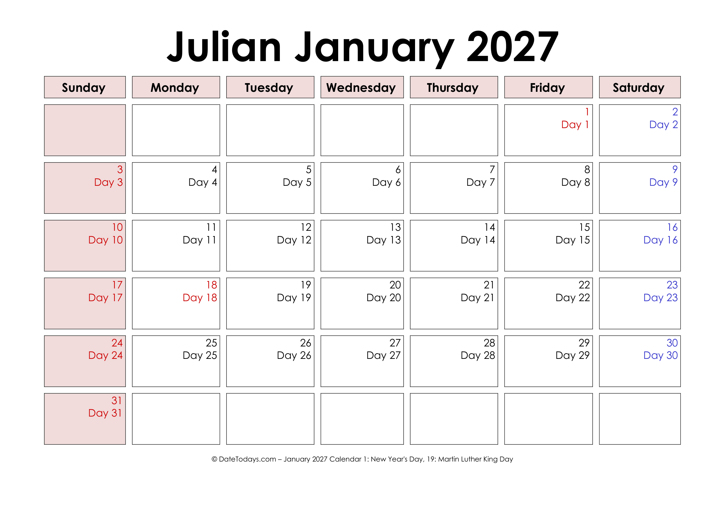 2027 julian calendar printable