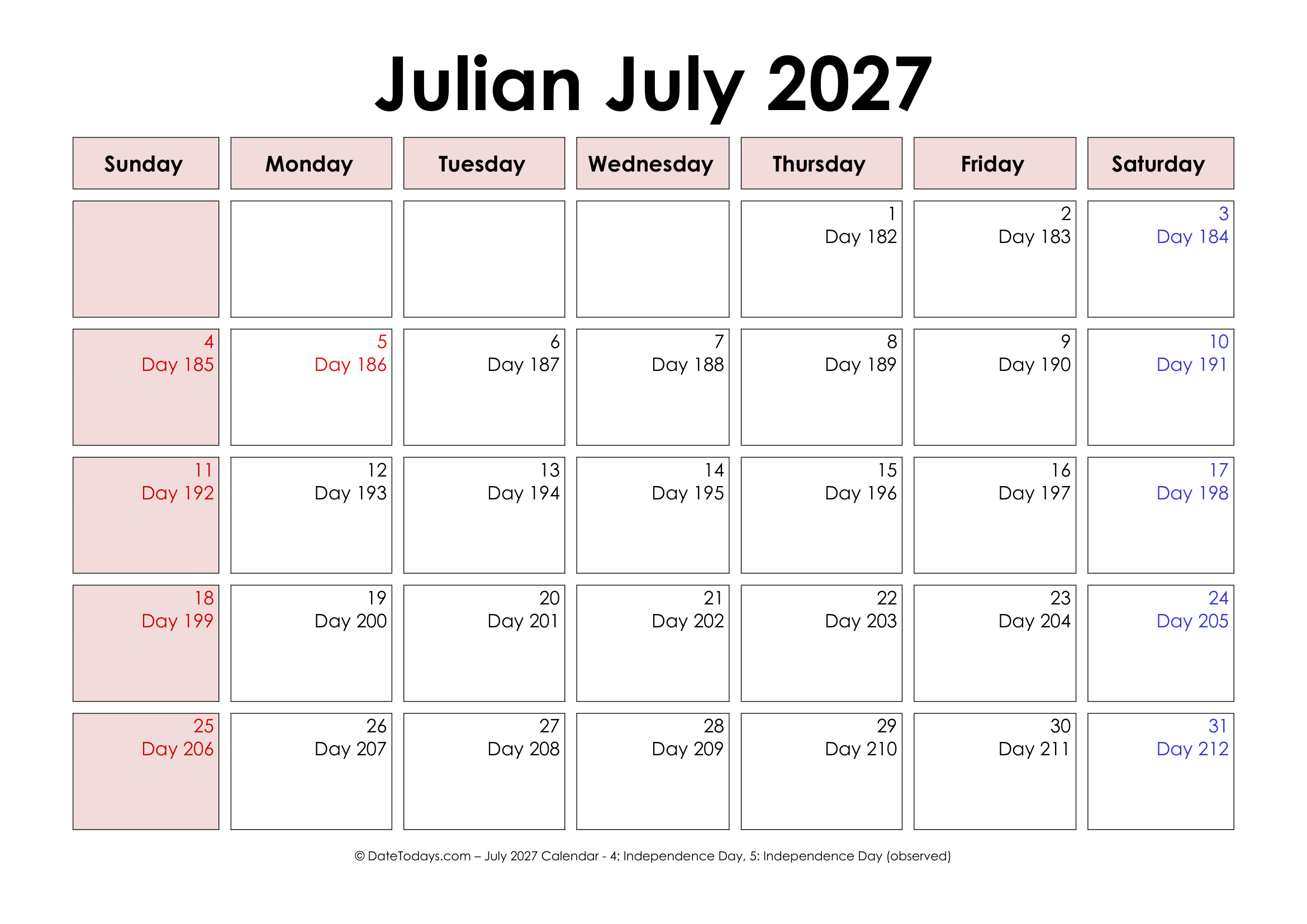 julian 2027 calendar printable pdf