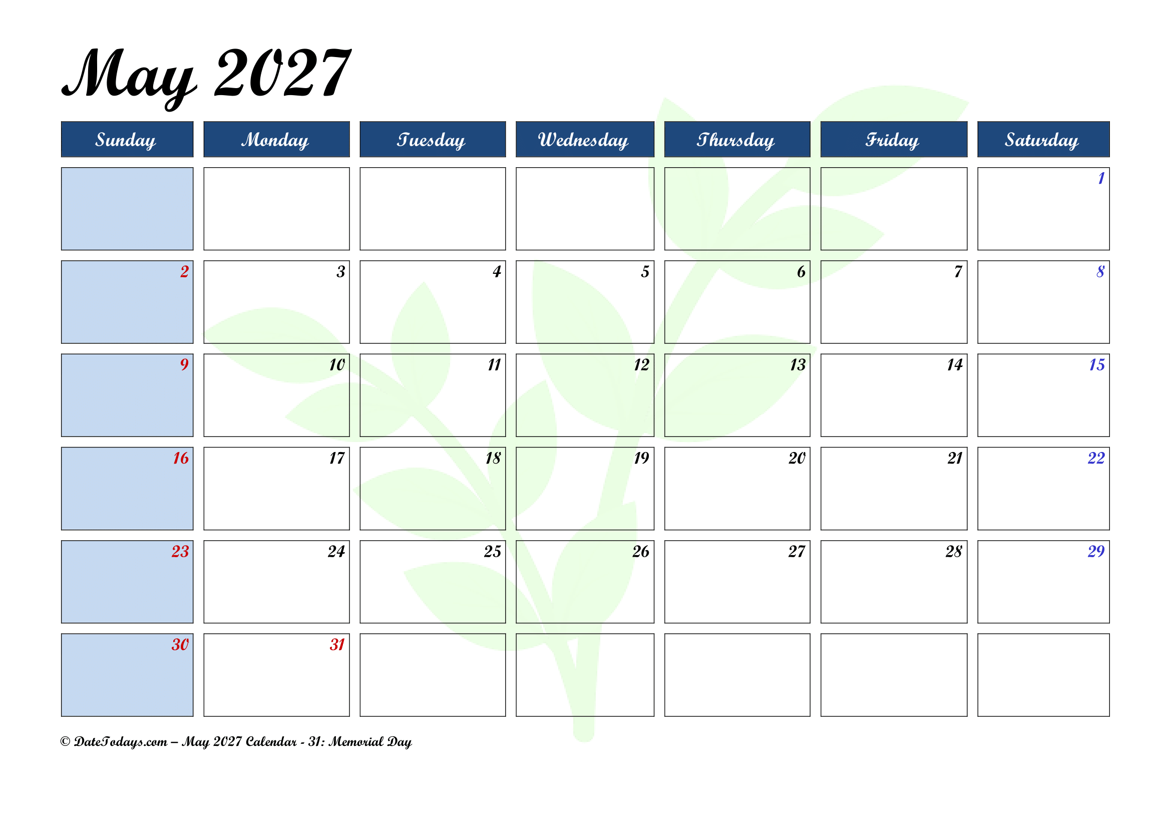 Mother’s Day is celebrated on Sunday, 9th May 2027 to honor the contribution of mothers to the family. Whereas Memorial Day is celebrated on 31th May 2027, Monday is assumed as a federal holiday in the US. On this day, people mourn the death of military personnel.