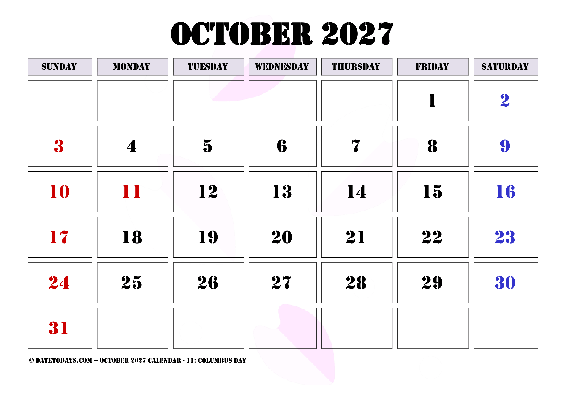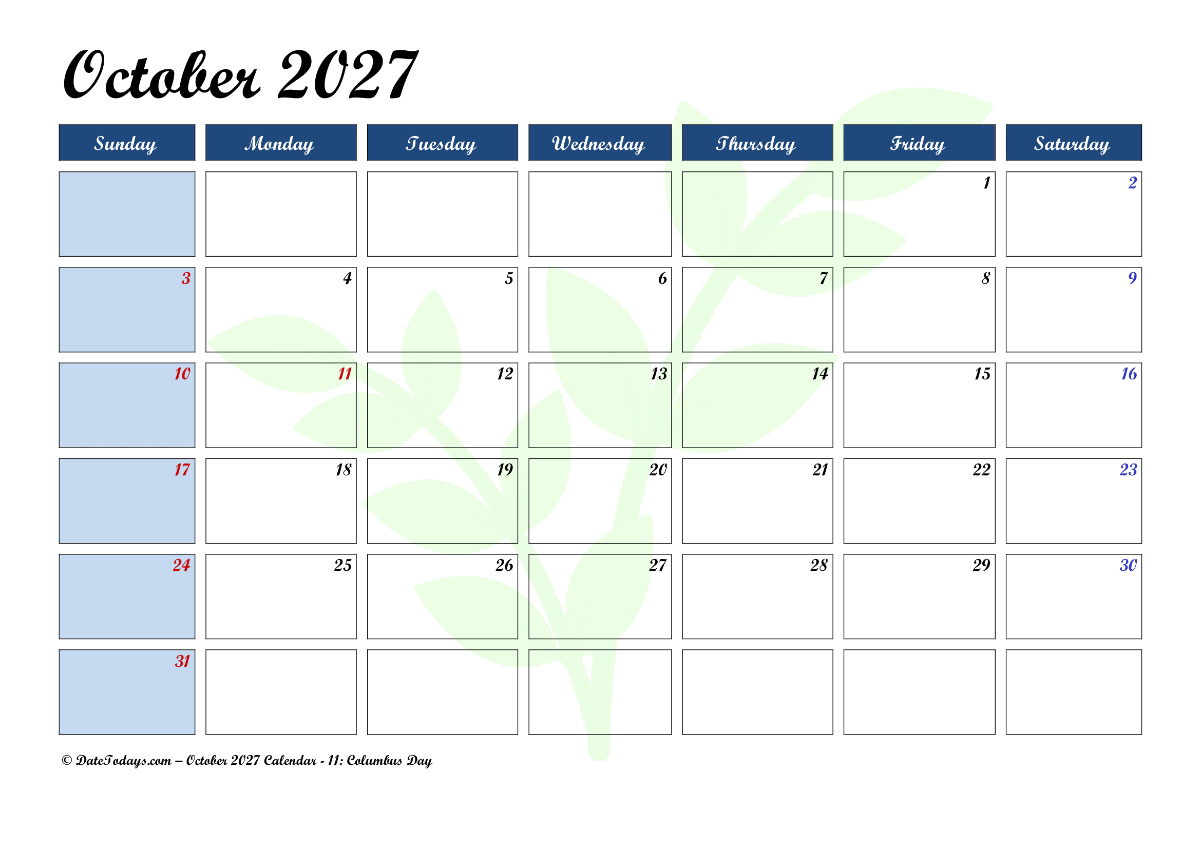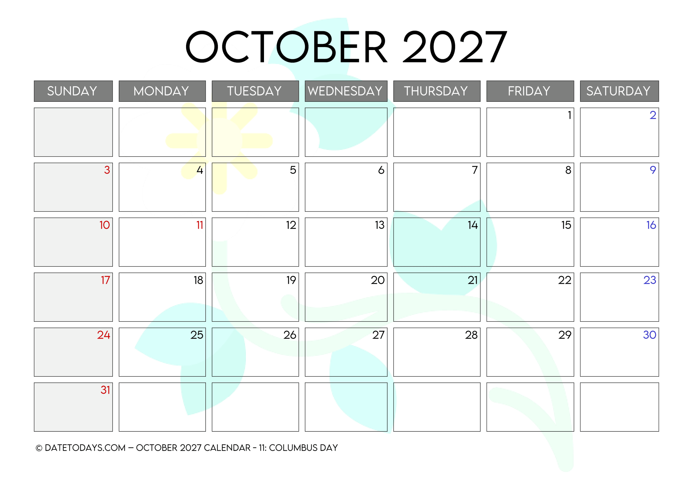 It is very easy to use, without needing of wifi or devices. And having October 2027 Printable Calendar PDF, it can help focus attention. This is a helpful for those who want to share an agenda or any timeline in a meeting, etc. October calendar 2027 Printable is best to plan the next few weeks.