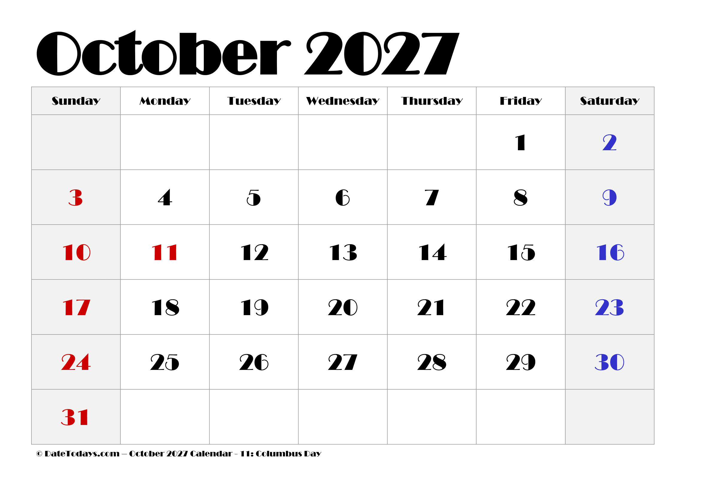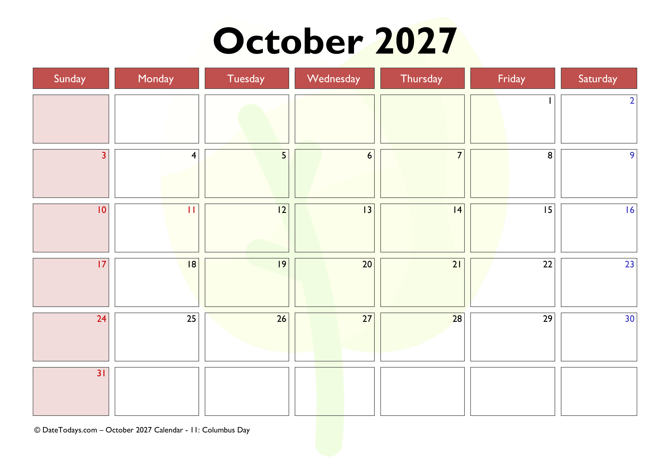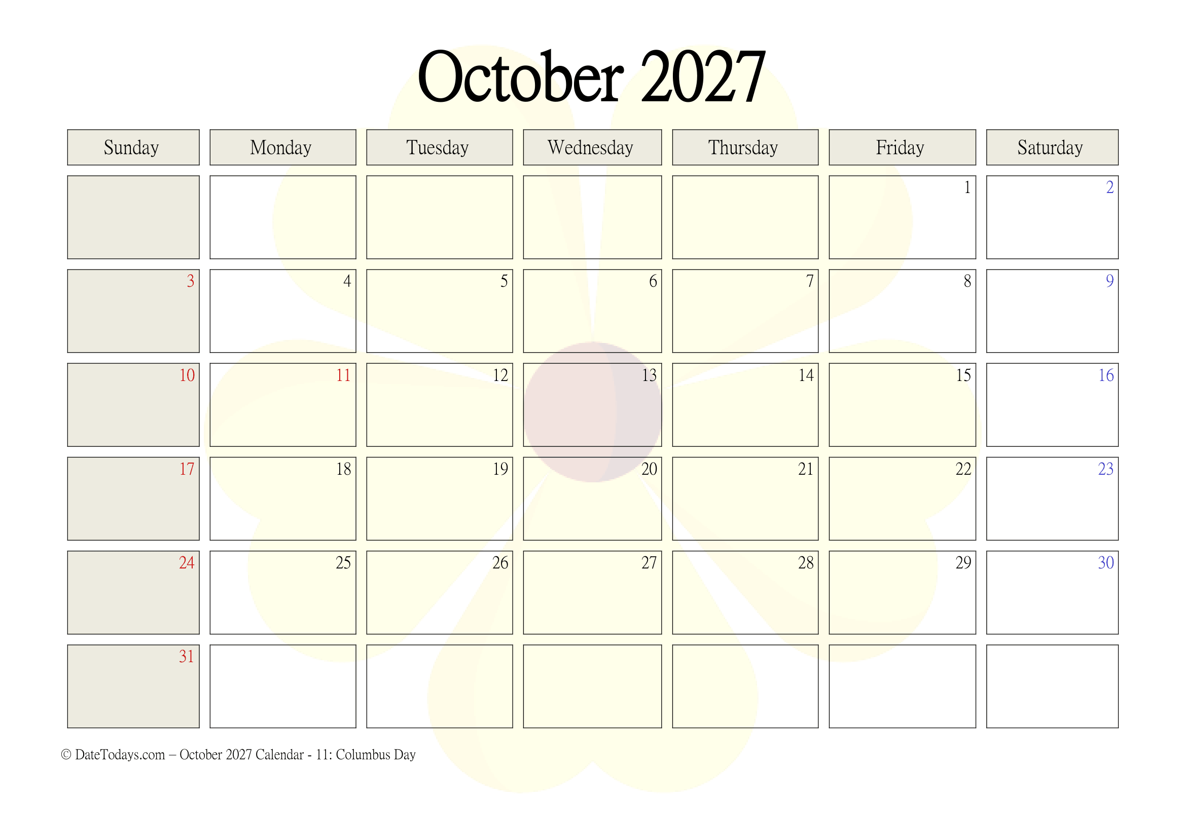 It is very easy to use, without needing of wifi or devices. And having October 2027 Printable Calendar PDF, it can help focus attention. This is a helpful for those who want to share an agenda or any timeline in a meeting, etc. October calendar 2027 Printable is best to plan the next few weeks.