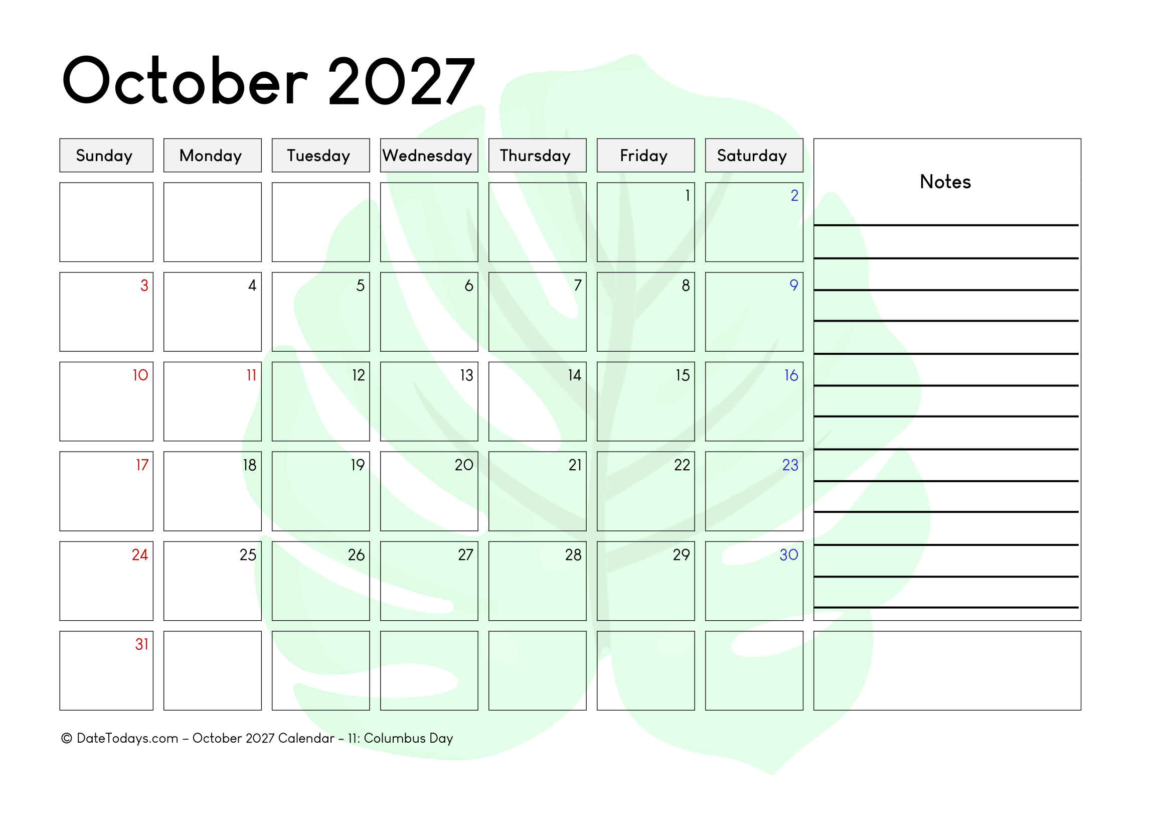 October 2027 Calendar templates are highly useful in many ways such as track habits, run a meeting, stay on top of your agenda, add important tasks, share a task list and many more.
